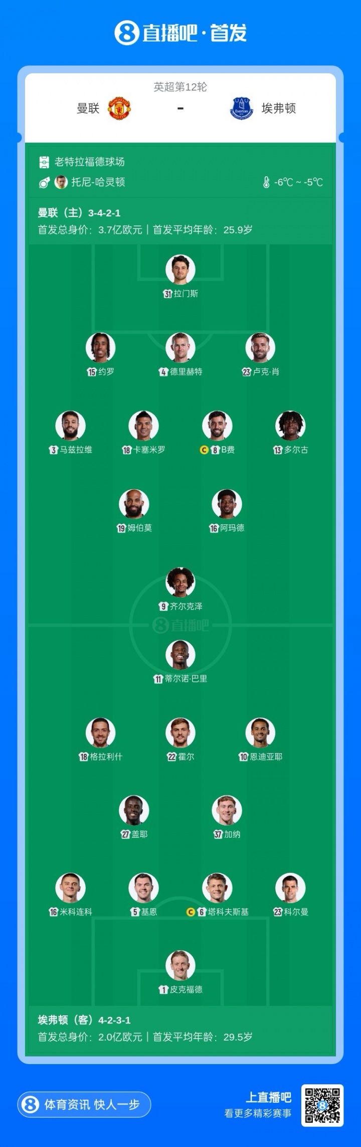 曼联vs埃弗顿首发:皆尔克泽、阿玛德先发,库尼亚缺阵利马回来