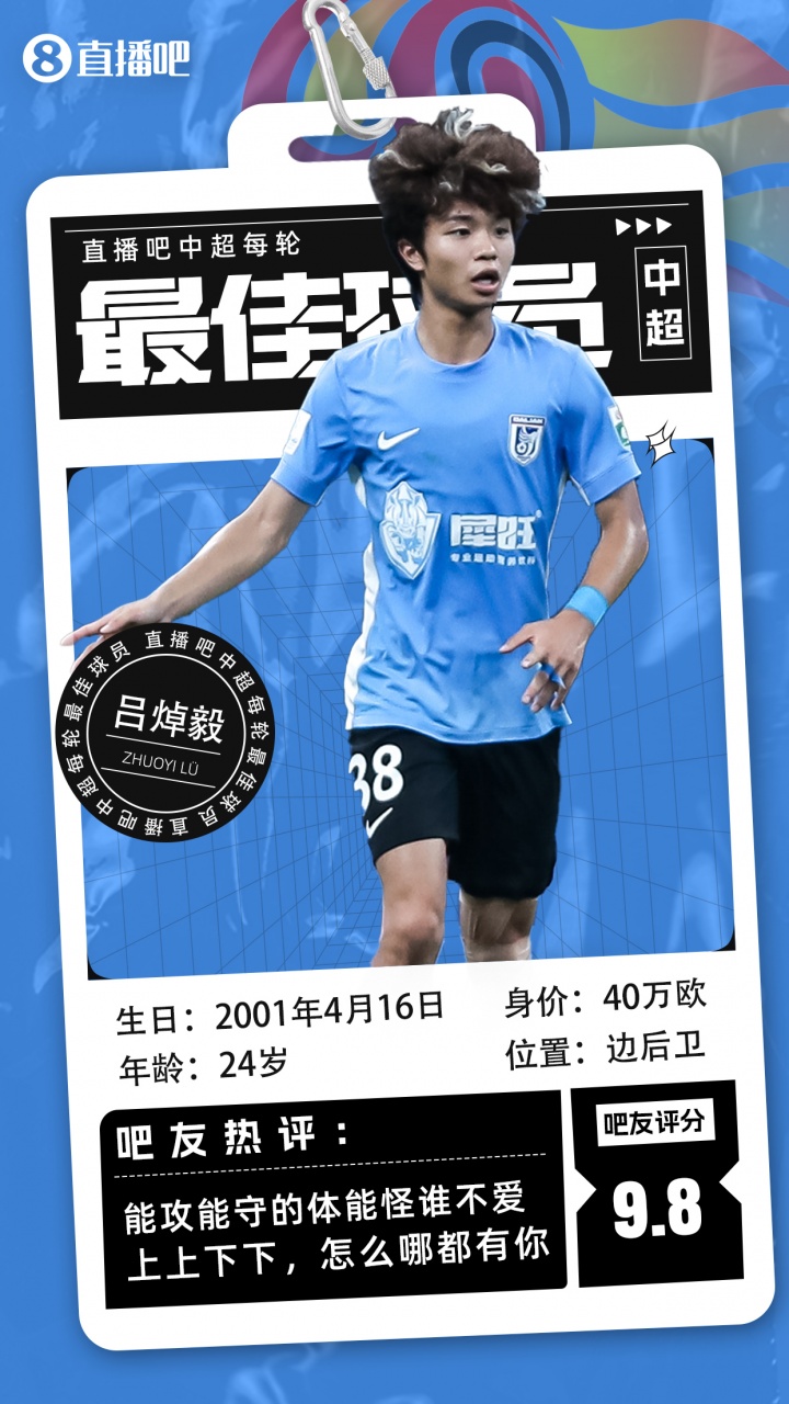 在【第19轮中超最好】评比中,吕焯毅取得了吧友以及裁剪的双双认同,初次当选每轮最好球员。
