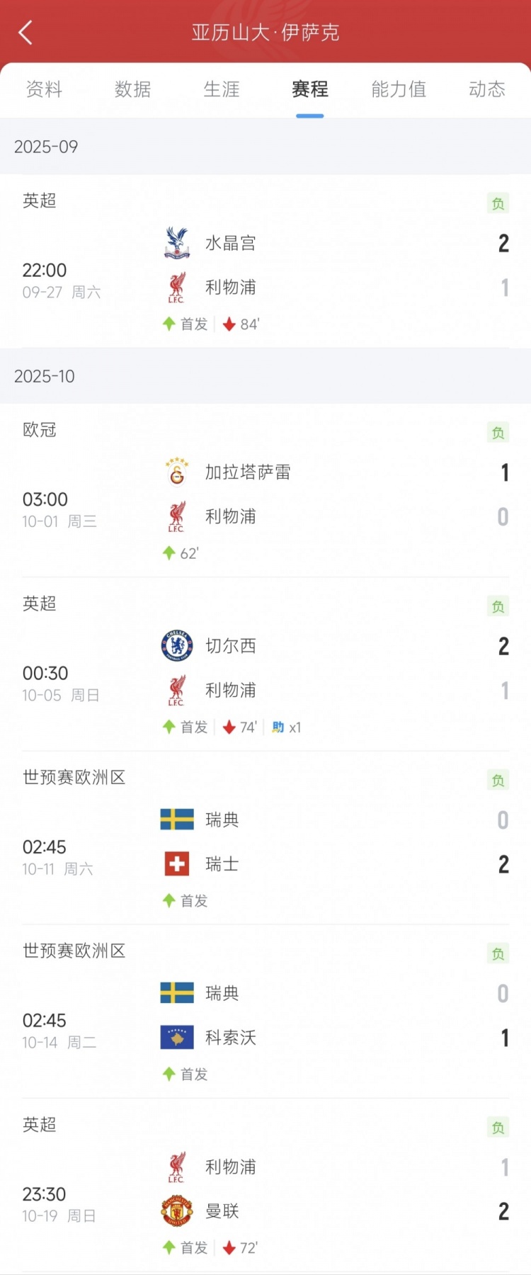 利物浦碰到4连败,而伊萨克本东说念主则碰到各项赛事6连败!其中英超不敌水晶宫、切尔西、曼联,欧冠客负加拉塔萨雷,世初赛代表瑞典队不敌瑞士和科索沃。时辰,伊萨克6场比赛仅在对阵切尔西的比赛中孝敬1次助攻。