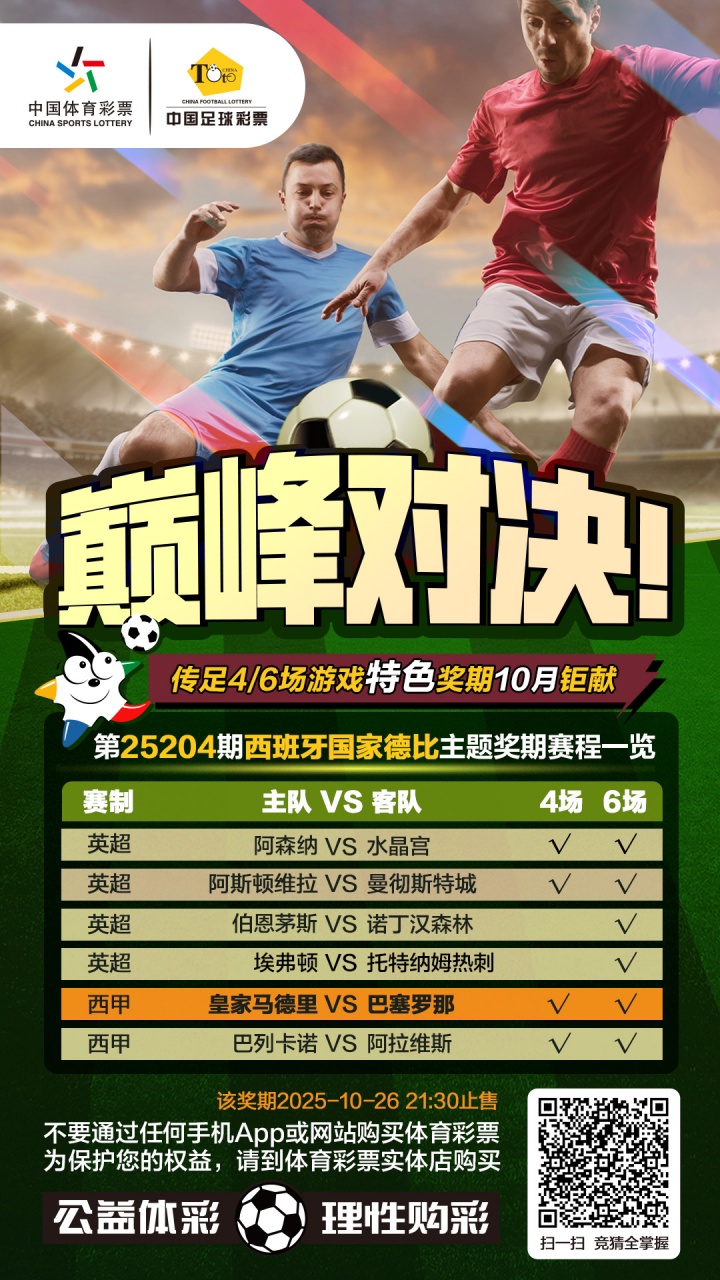 第25204期传足4/6场游戏性情奖期照旧于2025年10月22日20:00开售,将于2025年10月26日21:30停售,并于10月27日开奖,其中阿森纳VS水晶宫、阿斯顿维拉VS曼彻斯特城、皇家马德里VS巴塞罗那和巴列卡诺VS阿拉维斯为4场进球游戏竞猜赛事。