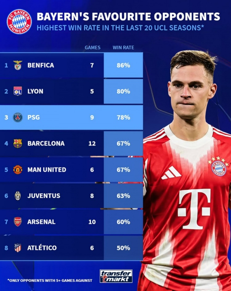 11月5日讯 在本轮欧冠,拜仁2-1打败巴黎,德转也统计了拜仁在近20个赛季欧冠对阵胜率最高的敌手(至少5次对阵),具体如下:
