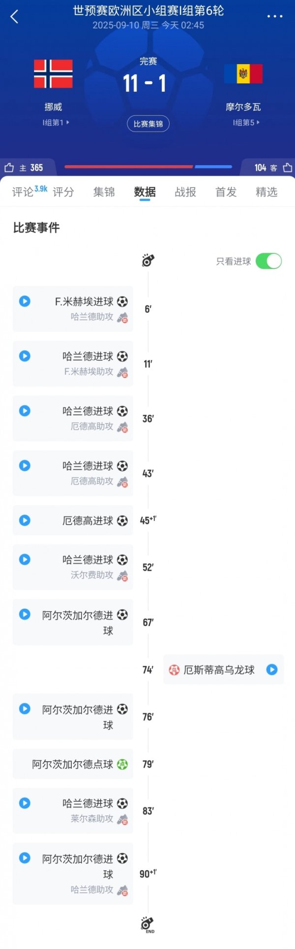09月10日讯 世初赛欧洲区I组,挪威11-1狂胜摩尔多瓦,挪威球员包办12粒进球,其中包含了一粒乌龙球。 比赛第74分钟,刚刚替补登场1分钟的挪威中卫厄斯蒂高回传,门将尼兰德猝不足防,皮球最终滚入球网。......查看更多
