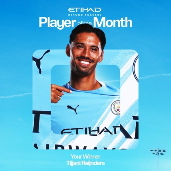3轮1球1助攻!曼城官方:27岁新援中场赖因德斯当选8月最好球员