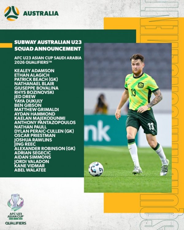 澳大利亚U23公布U23亚初赛大名单,9月1日说明23东谈主名单