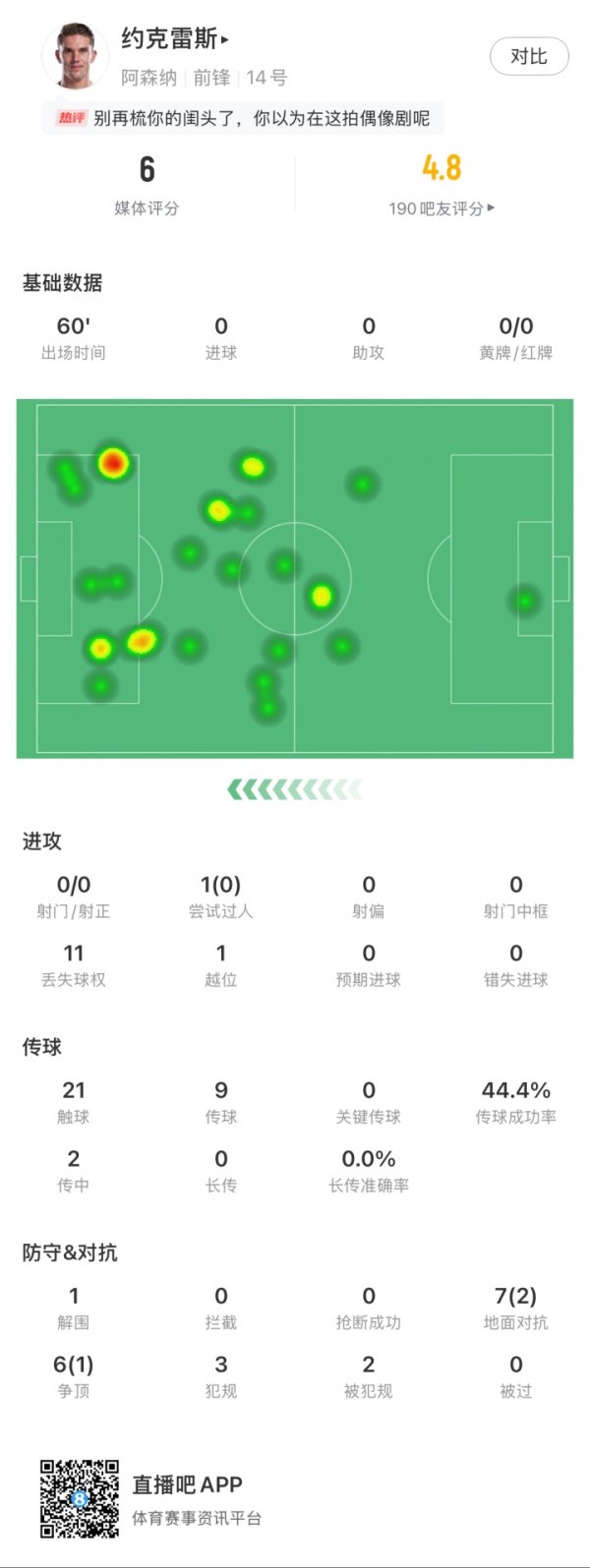 约克雷斯英超首秀60分钟被换下:0射门 11丢失球权 传球得手率44%