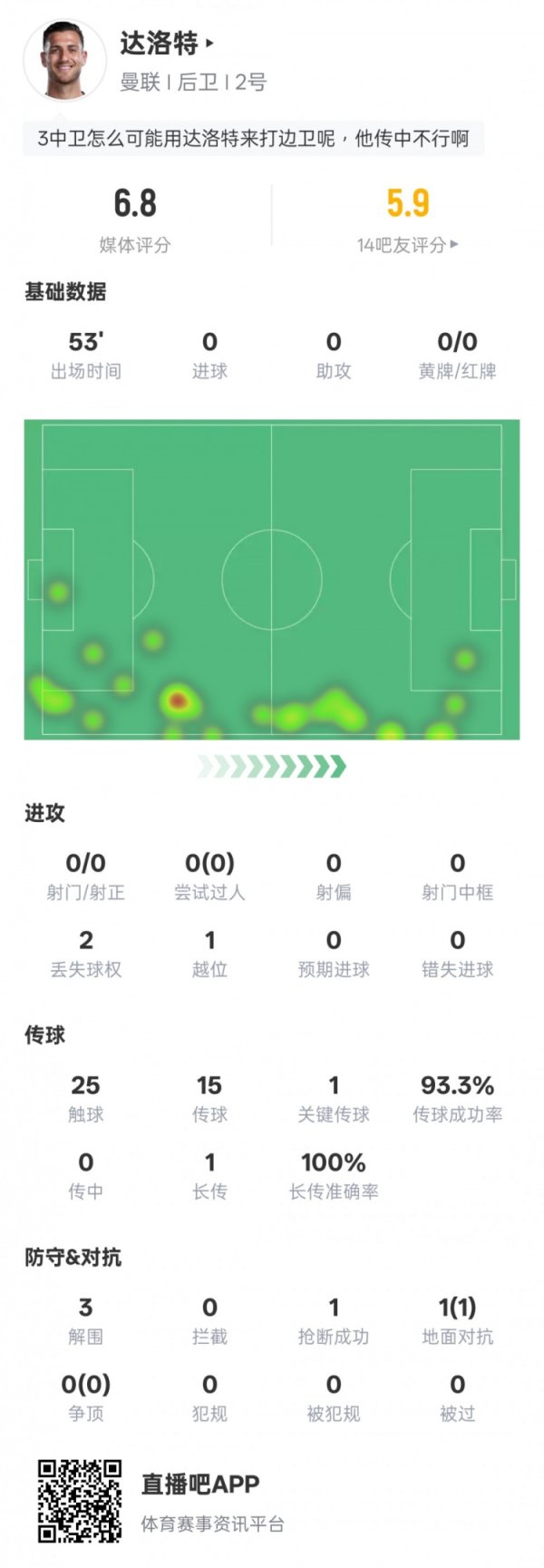 达洛特本场数据:3突围1要津传球&传球告捷率93.3%,评分6.8