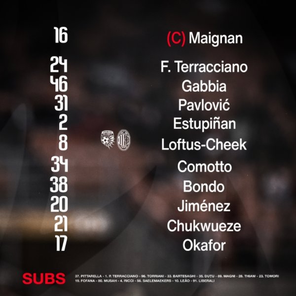 AC米兰vs珀斯光荣首发:丘库埃泽、奥卡福领衔;埃斯图皮尼安先发