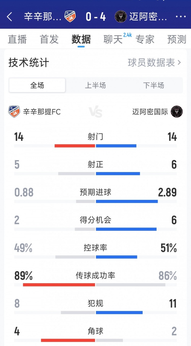 11月24日讯 在好意思职联1/4决赛,迈阿密海外4-0大捷辛辛那提FC,以下为两边全场数据对比: