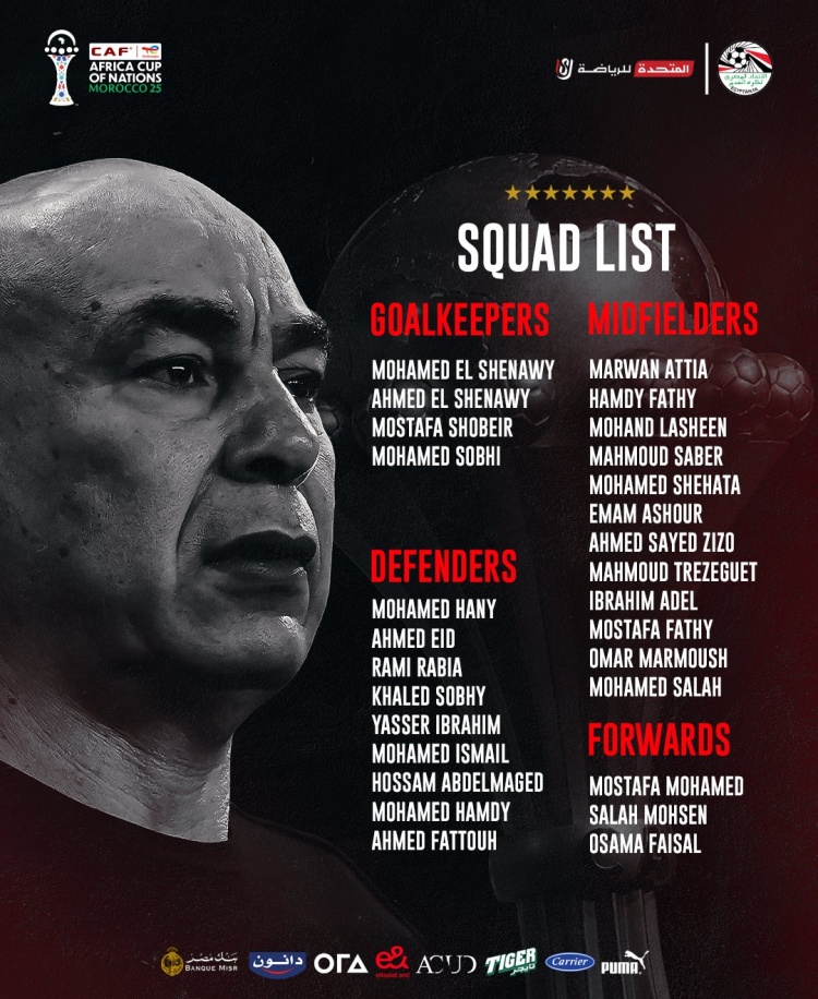 中前场:阿提亚(开罗国民)、哈姆迪·法特希(沃克拉体育)、拉辛(金字塔)、萨贝尔(Zed FC)、谢哈塔(扎马莱克体育)、阿卜杜勒加尼(开罗国民)、王人佐(开罗国民)、特雷泽盖(开罗国民)、阿德尔(阿布扎比半岛)、穆斯塔法·法特希(金字塔)、马尔穆什(曼城)、萨拉赫(利物浦)、莫斯塔法·穆罕默德(南特)、莫森(马萨雷)、费萨尔(埃及国度银行体育)