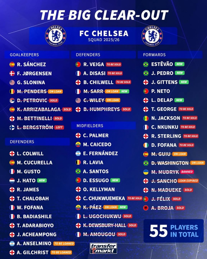 大瘦身😮上赛季切尔西阵中出现55东说念主,19东说念主已离队&11东说念主待售/外租