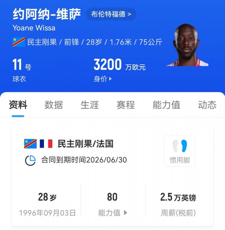 28岁的维萨当今的德回身价为3200万欧元,他与布伦特福德的契约将于来岁到期。