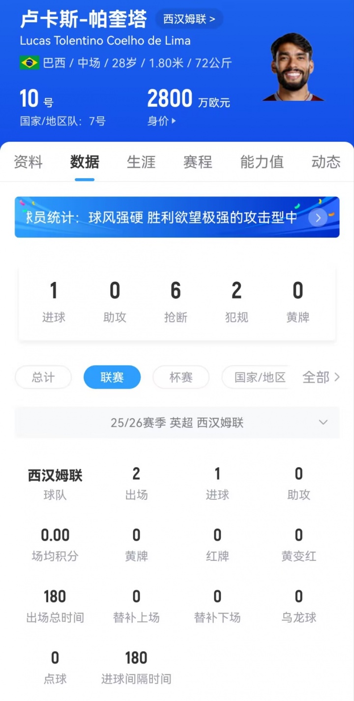 现年28岁的帕奎塔本赛季为西汉姆联出战了前两轮英超联赛,并在对切尔西的比赛中打入一粒全国波。