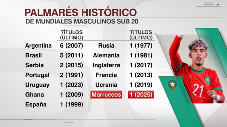 据ESPN统计,摩洛哥是第13个获取世青赛冠军的国度,而阿根廷获取6次世青赛冠军,所有这个词国度中最多。