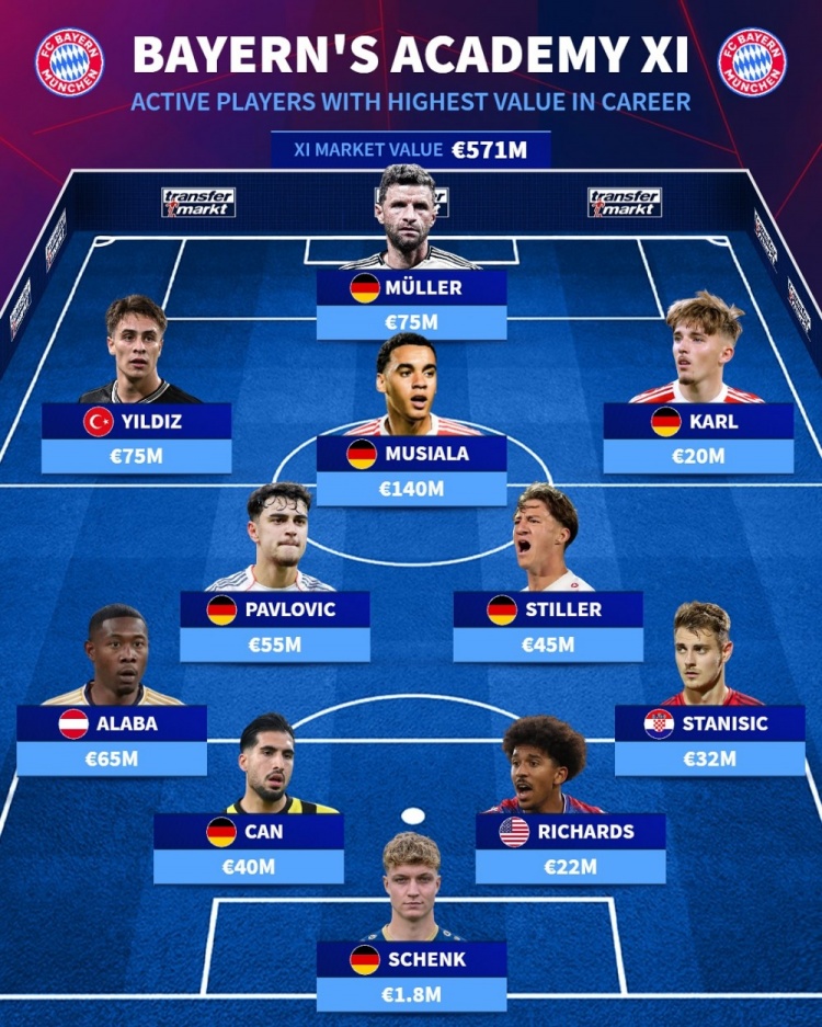 拜仁青训降生现役球员身价最高声势(取历史最高身价,总价5.71亿欧):