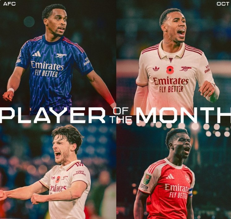 阿森纳官方10月最好球员候选:赖斯、萨卡、加布里埃尔、廷伯