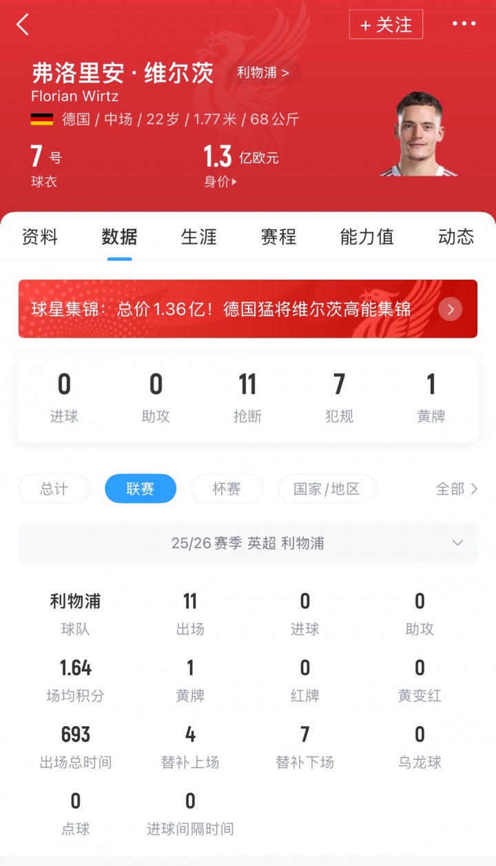 维尔茨在今夏以1.25亿欧元转会费加盟利物浦,当今这位德国中场在英超出场11轮后仍莫得赢得进球以及助攻。