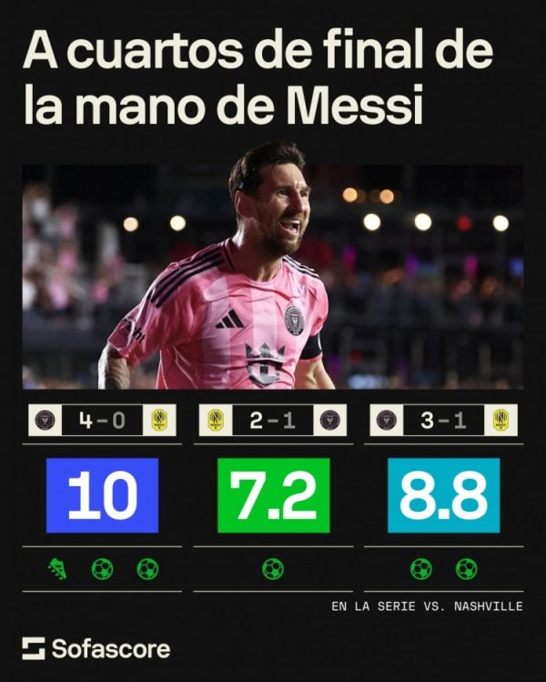 场均参与2球!梅西3场季后赛5球1助,评分8.8、7.2、10分