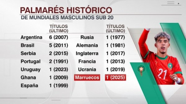 10月20日讯 2025世青赛(U20)决赛,摩洛哥2-0驯顺阿根廷,初度取得世青赛冠军! 本届世青赛在智利举行,摩洛哥半决赛点球大战险胜法国,初度干预世青赛决赛。决赛濒临6战6胜、实力雄壮的阿根廷,亚西尔·扎比里梅开二度,匡助摩洛哥2-0胜出夺冠。 摩洛哥足球 2022年——首进天下杯四强 2024年——首进奥运会男足四强,最终取得铜牌 2025年——初度取得世青赛冠军......查看更多