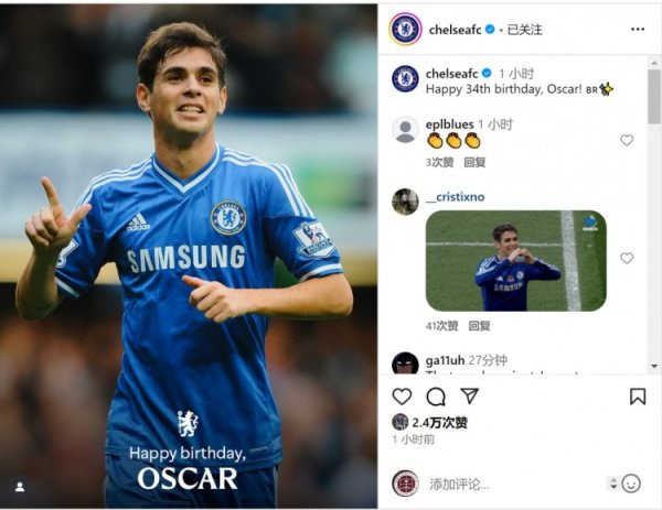 切尔西祝奥斯卡34岁诞辰兴隆,效率蓝军技艺出战203场38球31助