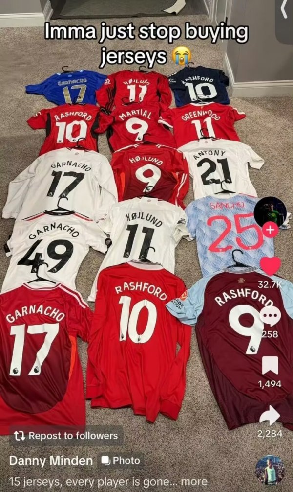 海外曼联球迷购买了15件曼联球员的球衣,包含加纳乔、霍伊伦、拉什福德、马夏尔、格林伍德、安东尼和桑乔,如今这7名球员照旧扫数离队。 该球迷叹惜:我如故别再买球衣了😭。......查看更多