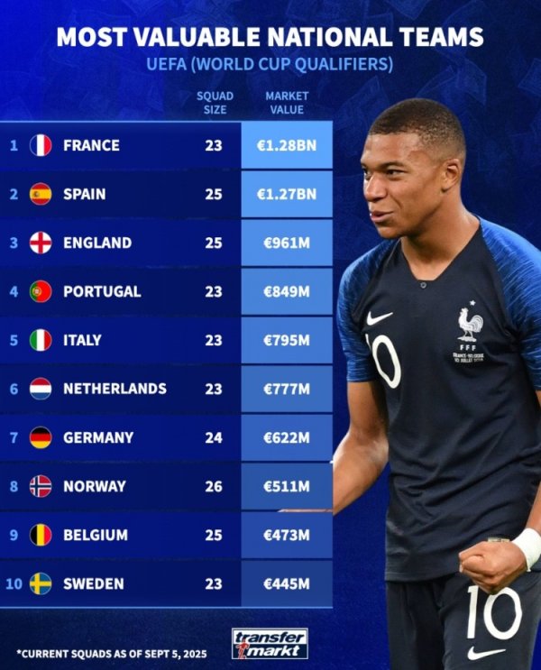 德转列欧洲国度队身价榜:法国压西班牙居首,英葡意荷德列前七