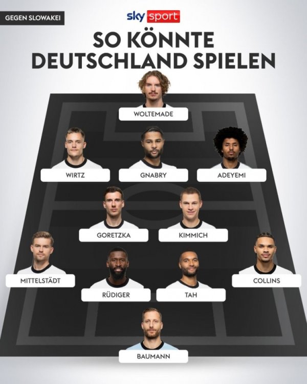9月3日讯 德国队将在本轮世初赛客战斯洛伐克,《德国天外体育》展望了德国队首发情况,拜仁4将最多。 德天外展望德国队首发: 前卫:维尔茨(利物浦)、沃尔特马德(纽卡斯尔)、阿德耶米(多特) 中场:格雷茨卡(拜仁)、格纳布里(拜仁)、基米希(拜仁) 后卫:米特尔施塔特(斯图加特)、吕迪格(皇马)、若纳坦-塔(拜仁)、纳姆迪-科林斯(法兰克福) 门将:鲍曼(霍芬海姆)......查看更多