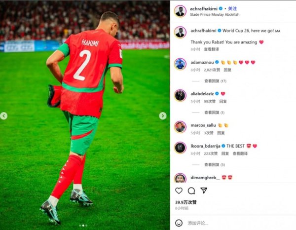 非洲首队!阿什拉夫社媒庆祝摩洛哥晋级:26年寰宇杯咱们来了!