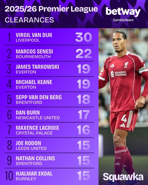 本赛季英超突围榜:范迪克30次居首,塞内西22递次二