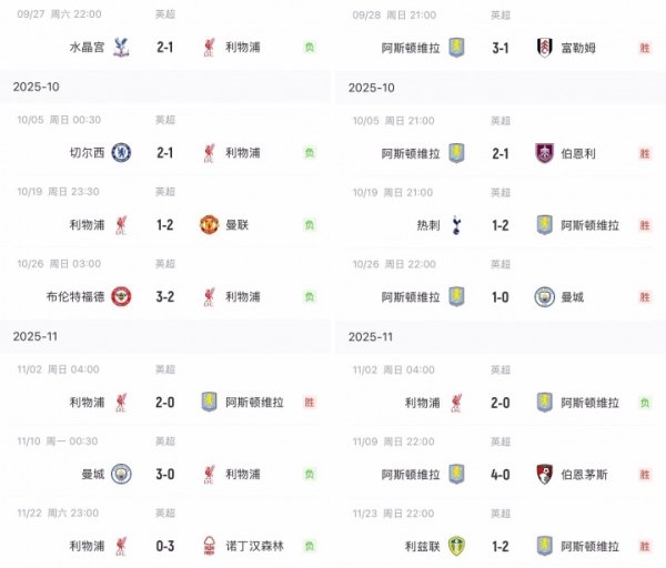 巧了么不是😅利物浦近7轮6负仅胜维拉,维拉近7轮6胜仅负利物浦