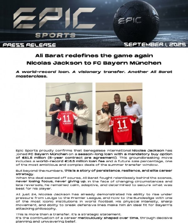 9月2日讯 杰克逊牙东谈主巴拉特的经纪公司EPIC SPORTS发文,狂赞杰克逊转会拜仁的走动。 这笔租出走动可谓在夏窗的终末时代一波又起,先是切尔西在杰克逊落地慕尼黑后短暂取消走动,随后又峰回路转,走动圆满终了。 杰克逊牙东谈主巴拉特供职的经纪公司以:“巴拉特再次改写转会商场,尼古拉斯-杰克逊认真加盟拜仁慕尼黑。”为标题,撰写了一篇力捧自家牙东谈主的著作。 著作写谈:“一笔创天下记录的租出走动,一次前瞻性的转会操作,又一次巴拉特的大众级操作。” “Epic Sports自重......查看更多