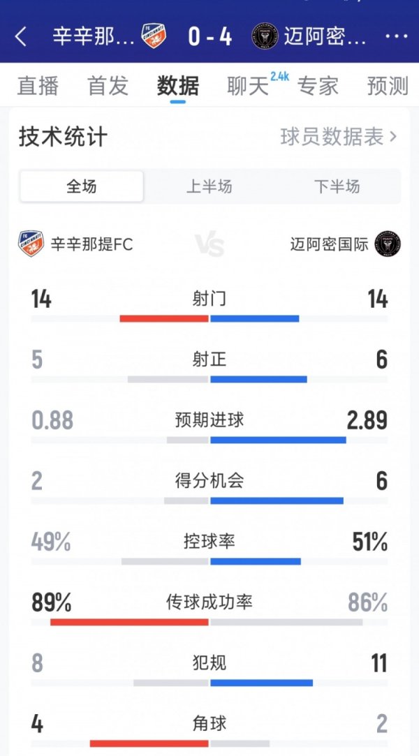 迈阿密海外4-0辛辛那提全场数据:射门14-14,射正6-5