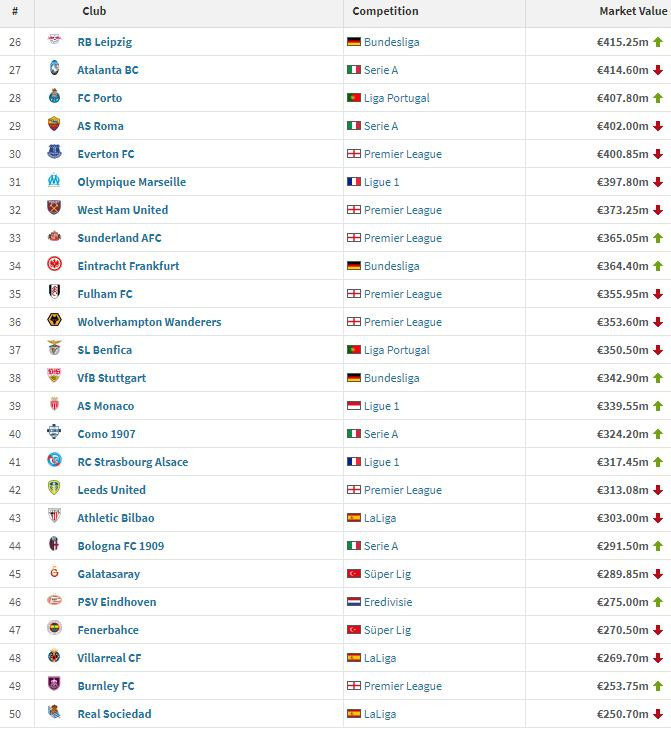 踏进前10的球队,还有排行第4位的巴黎圣日耳曼,排行第6位的巴萨以及排行第8位的拜仁。除了五大联赛球队以外,葡萄牙体育以4.63亿排行最高,但仅排行第23位。