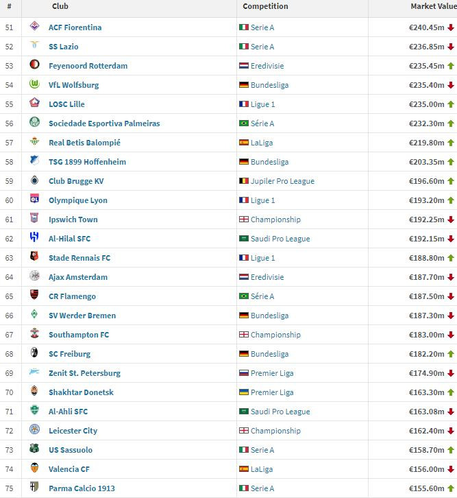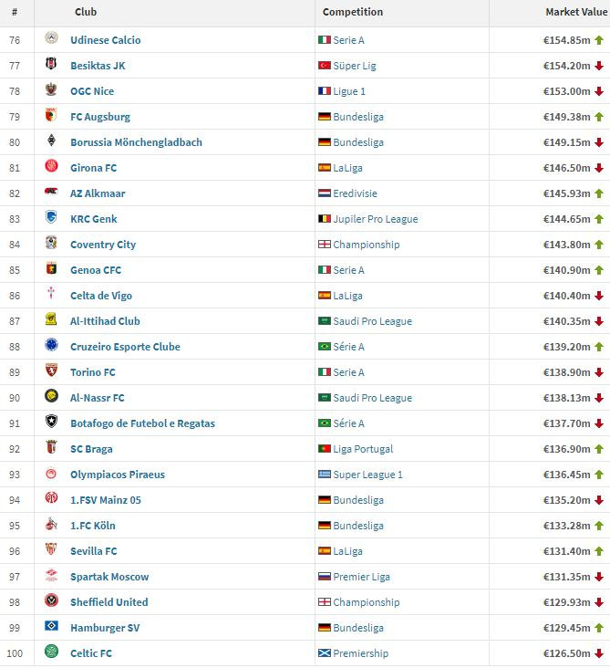 在亚洲球队里,利雅得月牙排行最高欧冠小组赛,以1.92亿排行第62位,其次是吉达国民(第71位,1.63亿)、吉达连合(第87位、1.40亿)以及利雅得回手(第90位、1.39亿)。