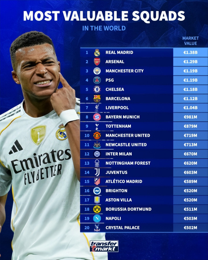 在这一瞥行榜上,皇马以13.88亿欧元排行榜首,也成为独逐个支身价跨越13亿的球队。其中,皇马领有姆巴佩、贝林厄姆、维尼修斯、巴尔韦德4名身价过亿的球员。