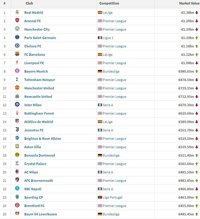 阿森纳、曼城两支英超球队则永诀以12.98亿、11.98亿排行第2、3位。值得强调的是,在排行前10位的球队里,英超球队占了6席,除了阿森纳、曼城以外,切尔西、利物浦、热刺、曼联永诀排行第5、第7、第9和第10位。