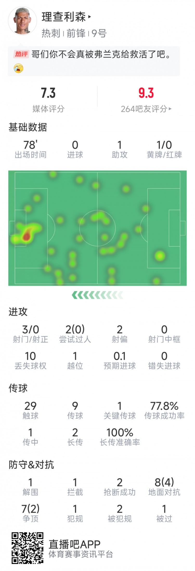 连场参与进球,理查利森本场数据:1次助攻,3射0正,2次抢断