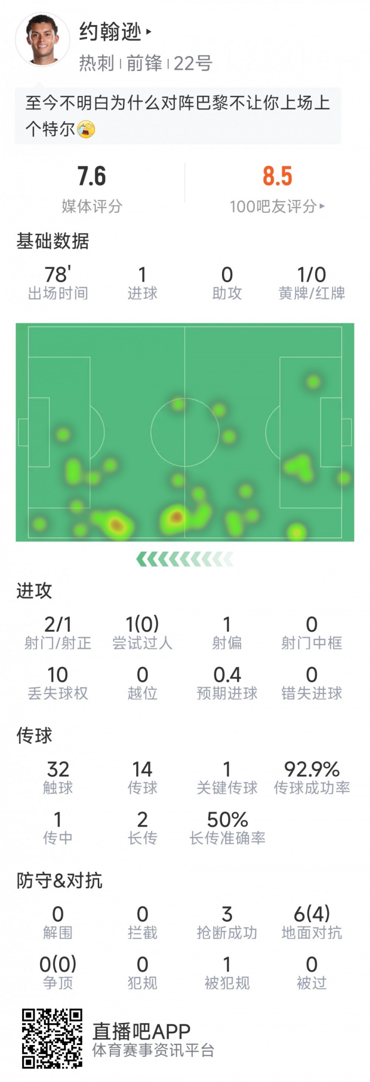 8月23日讯 在本轮英超热刺对阵曼城的比赛中,布伦南-约翰逊先拔头筹,以下为他在本场数据: