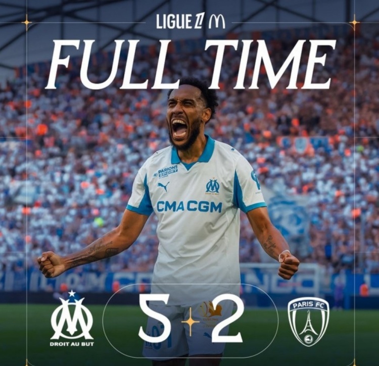 8月24日讯 法甲第二轮比赛,奥巴梅扬梅开二度,马赛主场5-2打败巴黎FC。