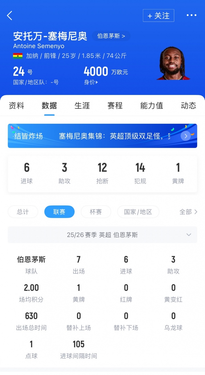 而伯恩茅斯方面以为,现年25岁的塞梅尼奥如今至少值7500万镑,本赛季于今,他仍是斩获6个联赛进球,并孝顺3次助攻。