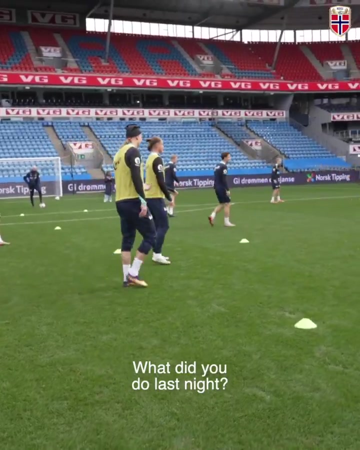 哈兰德戴麦克风进入挪威队闇练,嘲谑队友:你喝大了?
