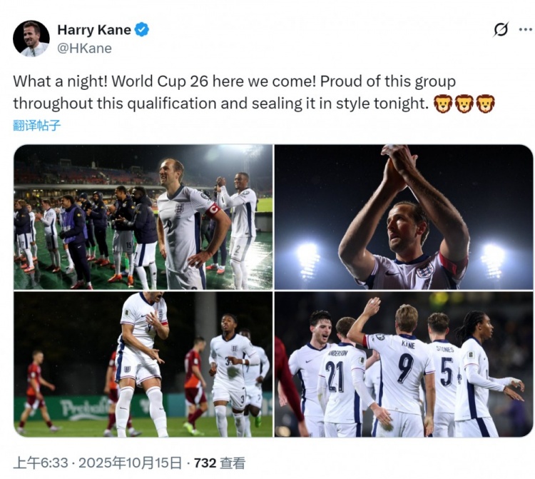 凯恩社媒庆祝出线:2026年全国杯咱们来了,为球队的泄漏感到自豪