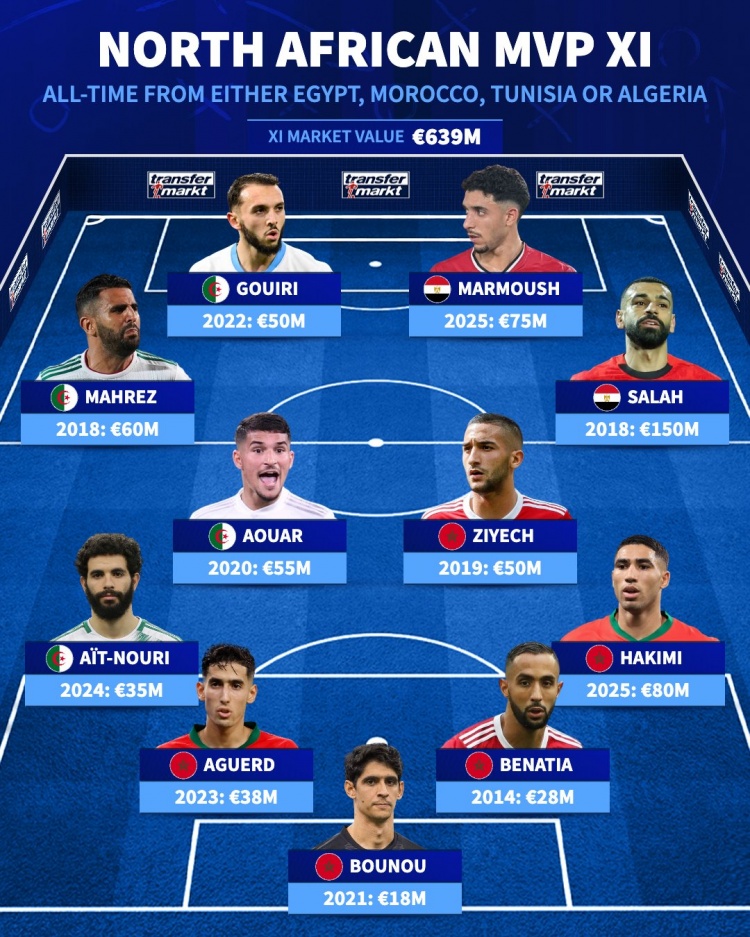 北非历史身价最高威望:萨拉赫领衔,阿什拉夫、马尔穆什在列