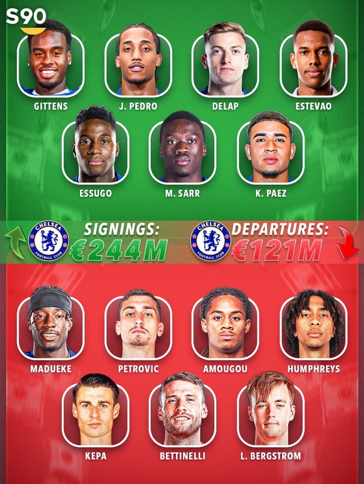 5-切尔西:转会支拨2.4377亿欧,转会收入1.2148亿欧,净支拨1.2229亿欧