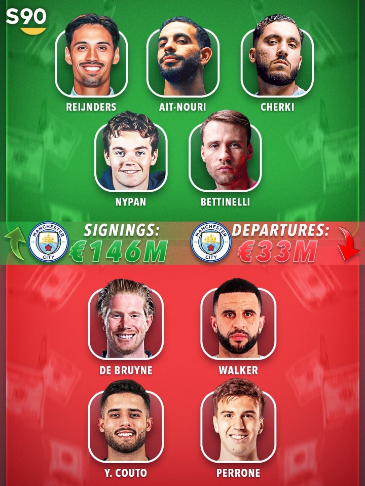 6-曼城:转会支拨1.457亿欧,转会收入3880万欧,净支拨1.069亿欧