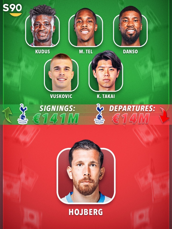 4-热刺:转会支拨1.406亿欧,转会收入1350万欧,净支拨1.271亿欧