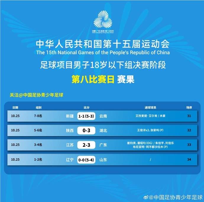 全运会U18男足排行:辽宁队夺得金牌 山东队获银牌 广东队获铜牌