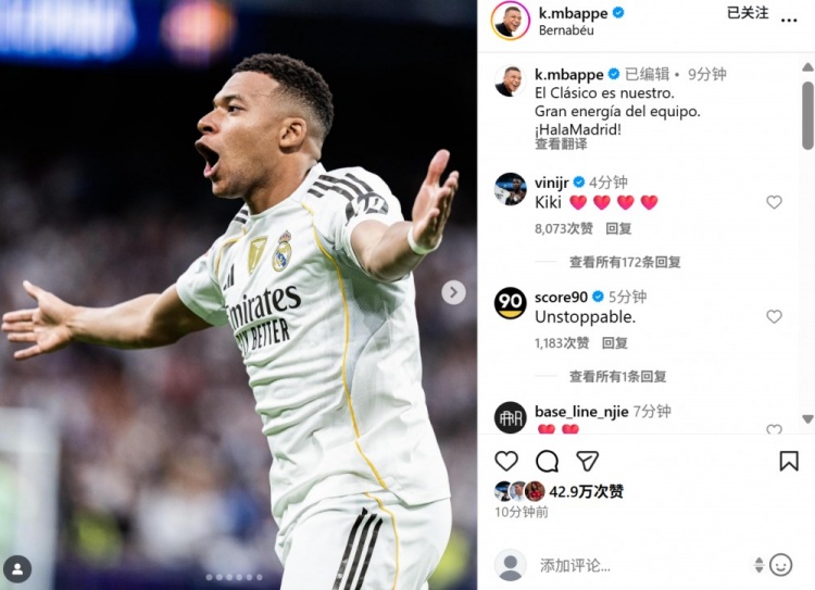 本场比赛姆巴佩破门,赛后他也在个东说念主社媒晒出庆祝进球像片,配文写说念:“国度德比胜仗属于咱们,球队展现出很棒的活力,皇马加油!”