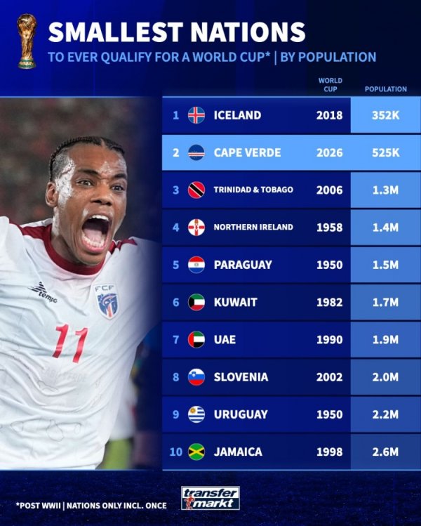 参预寰球杯东谈主口最少国度:冰岛35.2万居首,佛得角52.5万次席