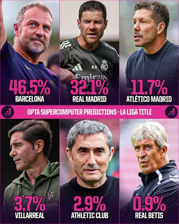 Opta揣摸西甲冠军包摄概率:巴萨46.5%,皇马32.1%,马竞11.7%