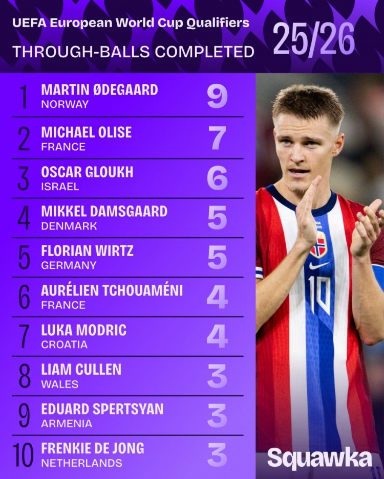 11月20日讯 本届世欧预小组赛还是告一段落,squakwa也统计了本届赛事直塞情况,厄德高领跑。